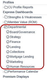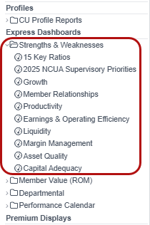 The Built-In Dashboard Library includes four main dashboard groups designed for credit union use cases.