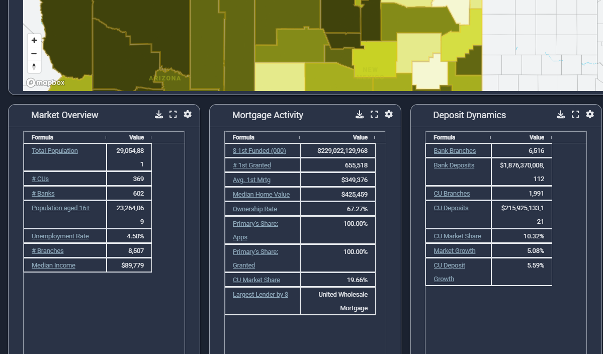 You will also find a summary of deposit dynamics in Market Share Reporting. This table includes details related branch counts and deposit growth data for your selected market(s).