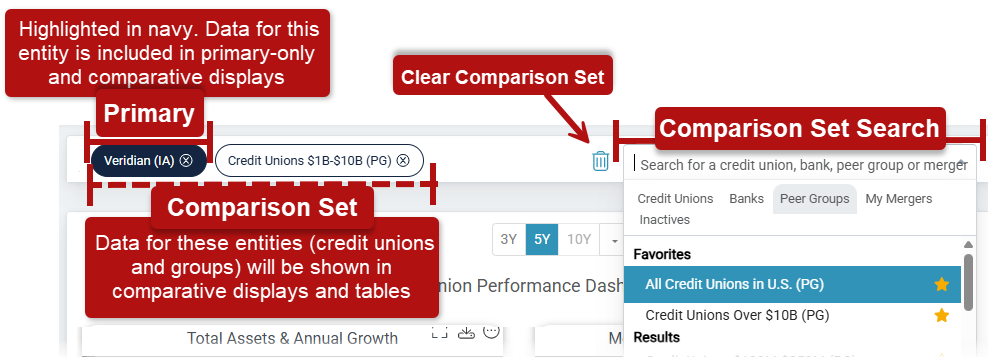 - Your credit union is set as the Primary institution and is highlighted in navy. This is based on your most recent NCUA 5300 data. The Primary institution is the focus of single‑institution views, such as the Credit Union Profile and portfolio charts.