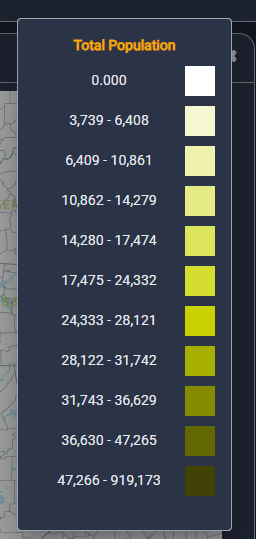 Use the i icon in the top left of your map to view the gradient breakdown for population for your league on the map.
