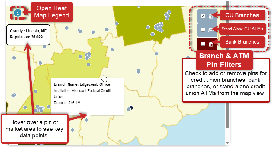 - Triangle CU ATM Pins: Represent freestanding credit union ATMs, while in-branch ATMs will appear in the Branch Snapshot. ATM data is specific to credit unions.