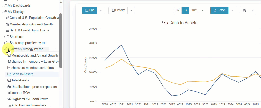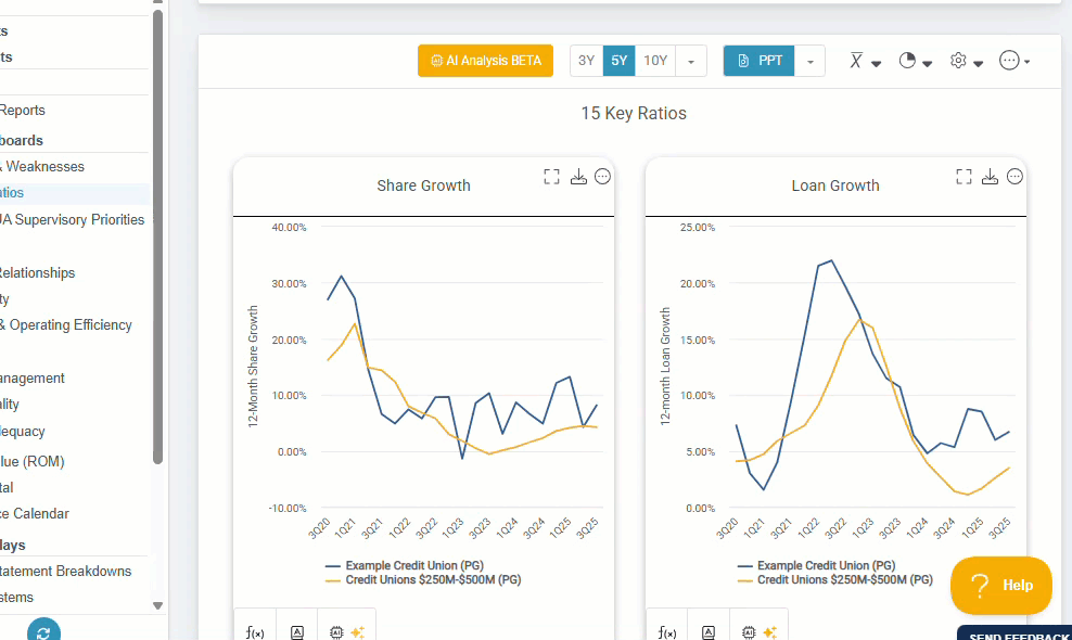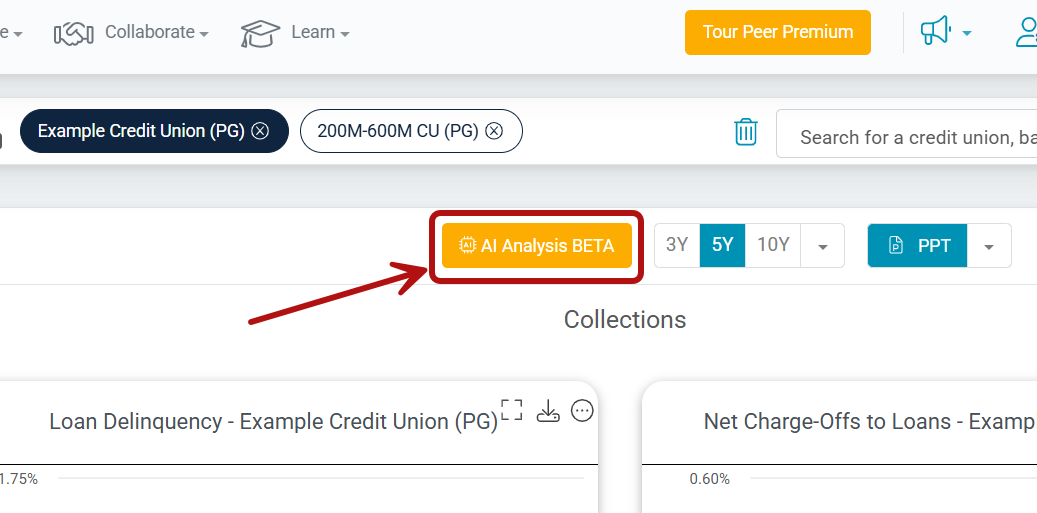 You’ll find the AI Dashboard Analysis option on most Peer Suite folders and dashboards, including built-in dashboards, credit union and bank data sections, and on your qualifying custom content.