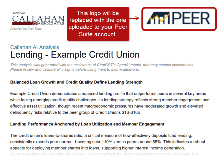 Callahan's AI Analysis works exclusively with the public datasets available in Peer Suite. To protect privacy, it is not available on proprietary datasets, such as non‑interest income Community Data.