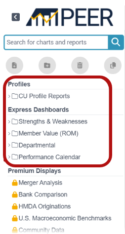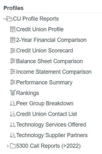 The Profile Reports section provides quick, at‑a‑glance views of individual credit unions and their performance context. These reports are especially useful for: