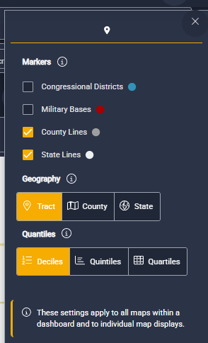 These overlays are especially helpful when discussing regulatory considerations, membership opportunities, or community-based strategies. Choose your geographic view. You can adjust how geography is displayed on the map by selecting one of the following: